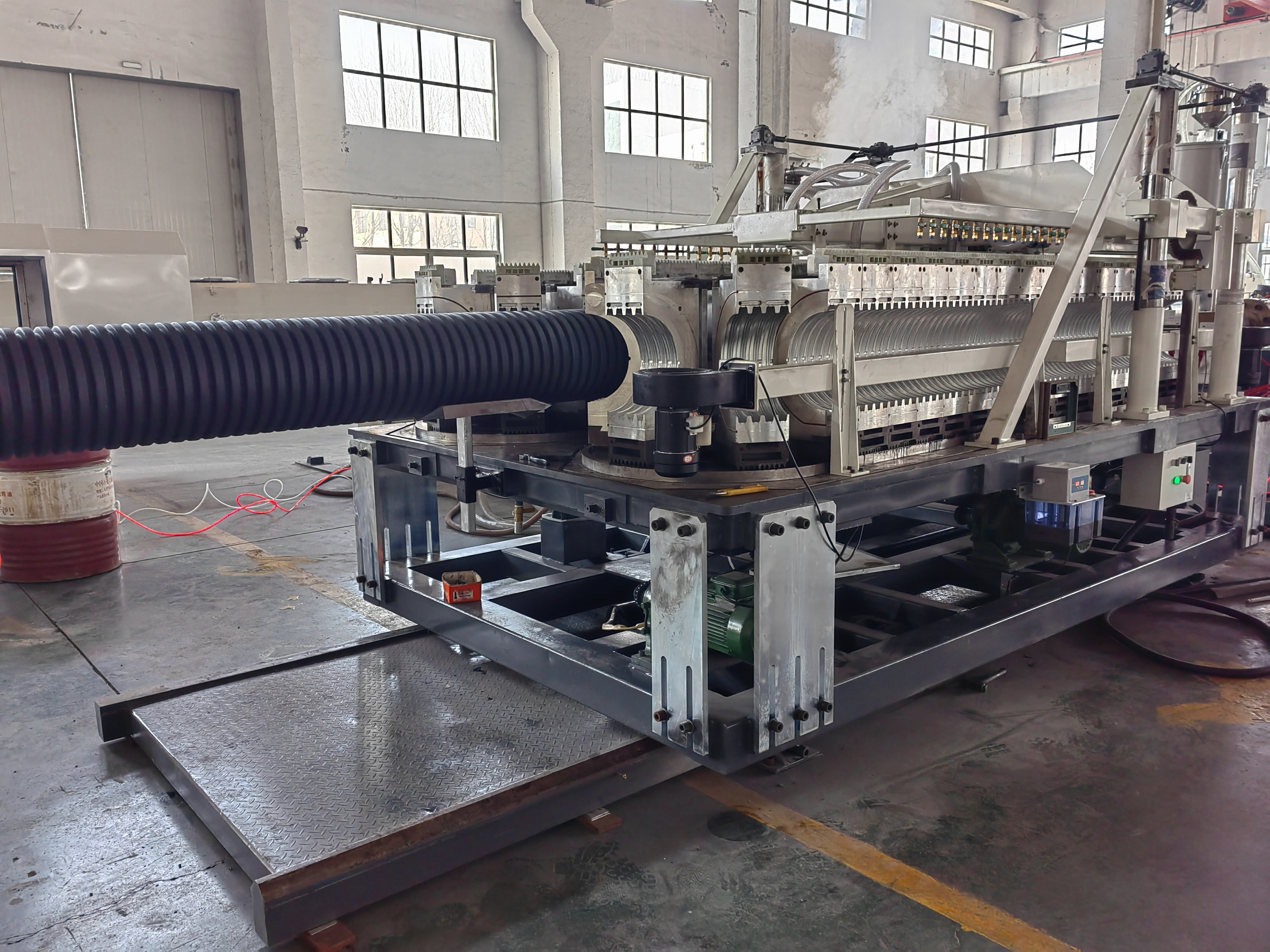 Jedną z kluczowych cech tej linii wytłaczania jest jej wysokiej jakości śrubka baryłowa o twardości HV>740.pozwalając na płynne i precyzyjne wytłaczanie materiałów do tworzenia rur falistychSystem pełnego zaangażowania intermeshing dodatkowo zwiększa proces wytłaczania promując jednolitość i spójność w finalnym produkcie.