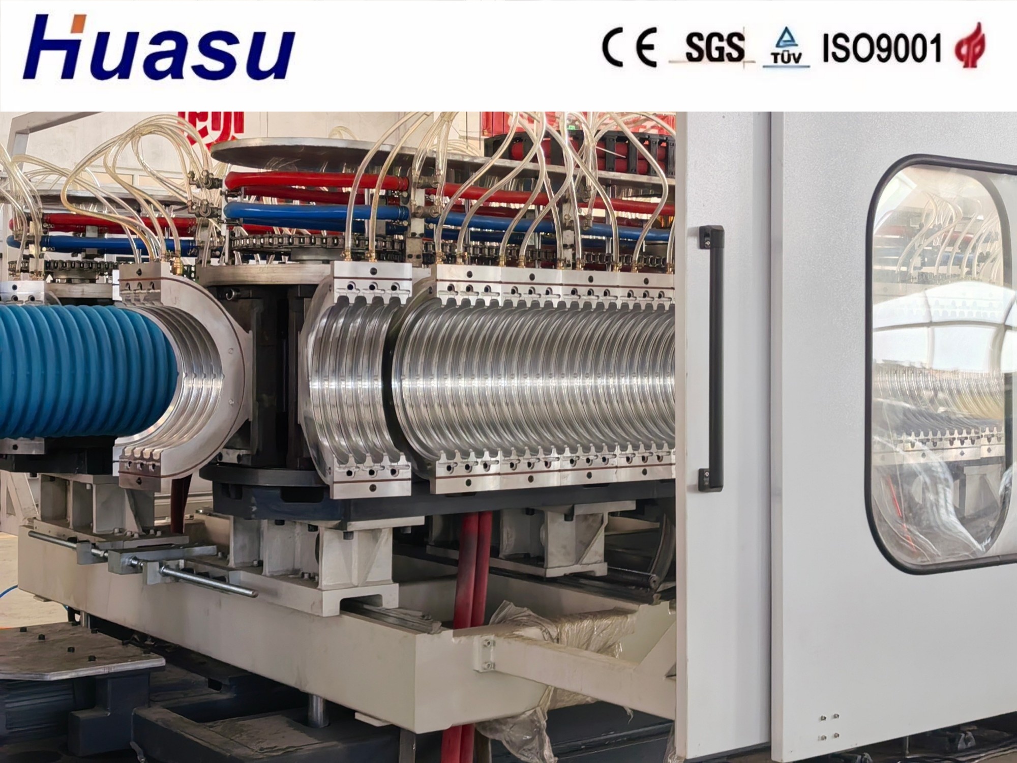Dwukrotnie ściana linia rur falistej reprezentuje trzecią generację ulepszonych produktów z Shandong HUASU.wydajność ekstrudera i prędkość produkcji rur są znacznie zwiększone o 20-40%.